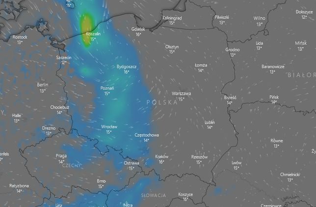 W nocy zachmurzenie umiarkowane, miejscami duże z przelotnymi opadami.